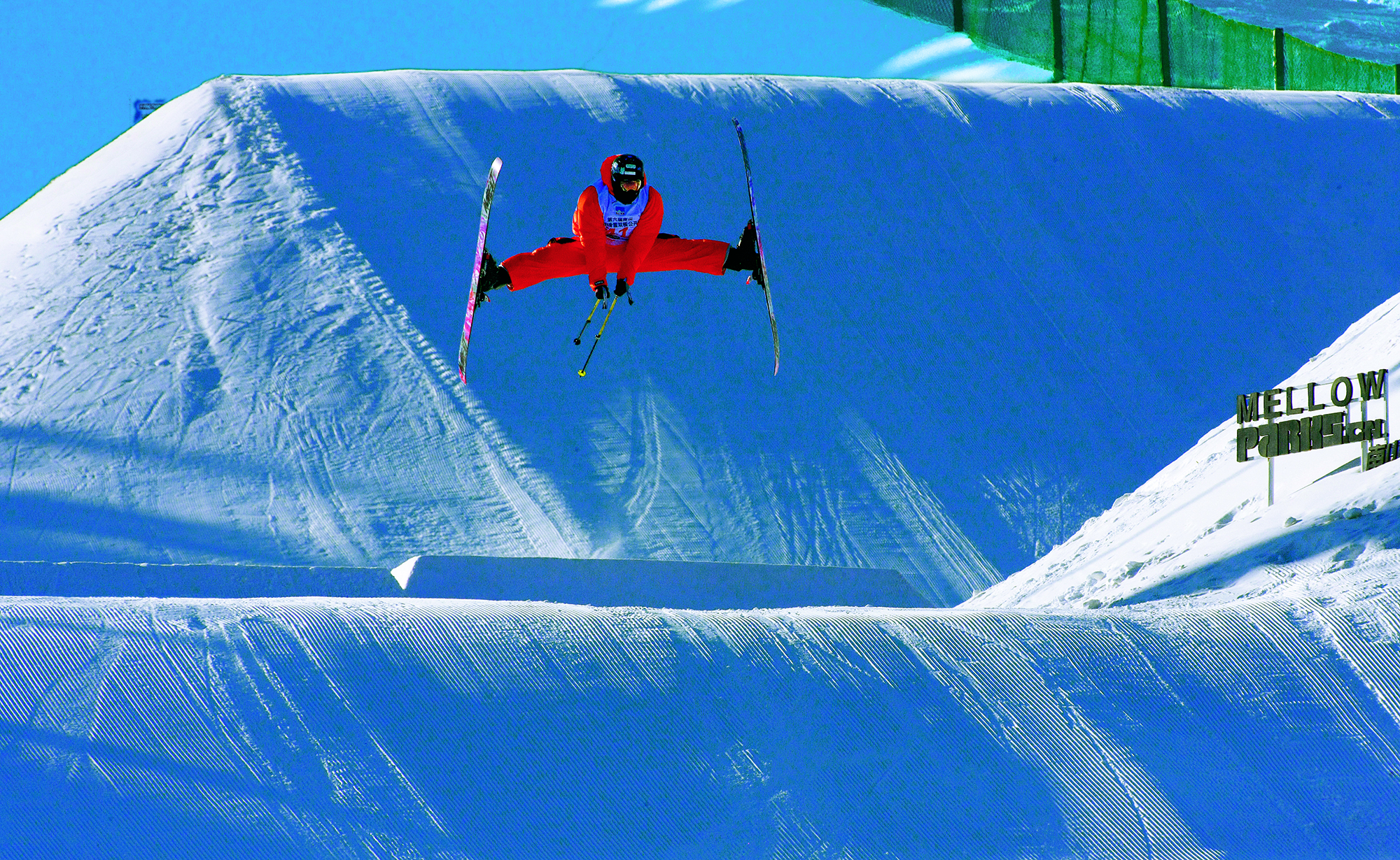 2022年1月16日,北京,第六届南山自由滑雪双板公开赛在密云南山滑雪场举行, 来自交大附中分校的15岁学生袁秭坤做自由式滑雪空中技巧动作