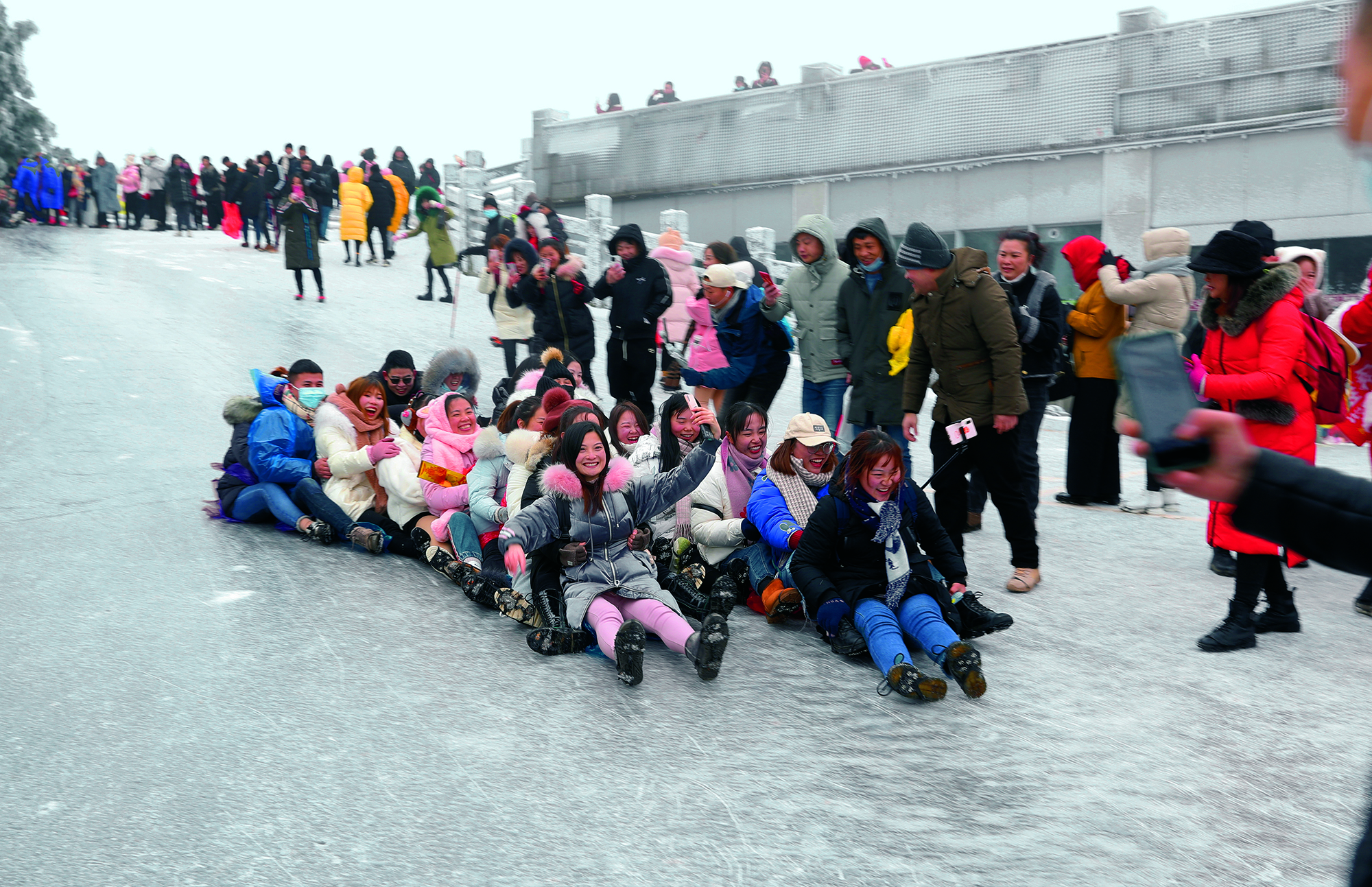 Tourists slide down an ice-covered slope at Mount Hengshan Scenic Area in Hengyang, Hunan Province, on December 15, 2020