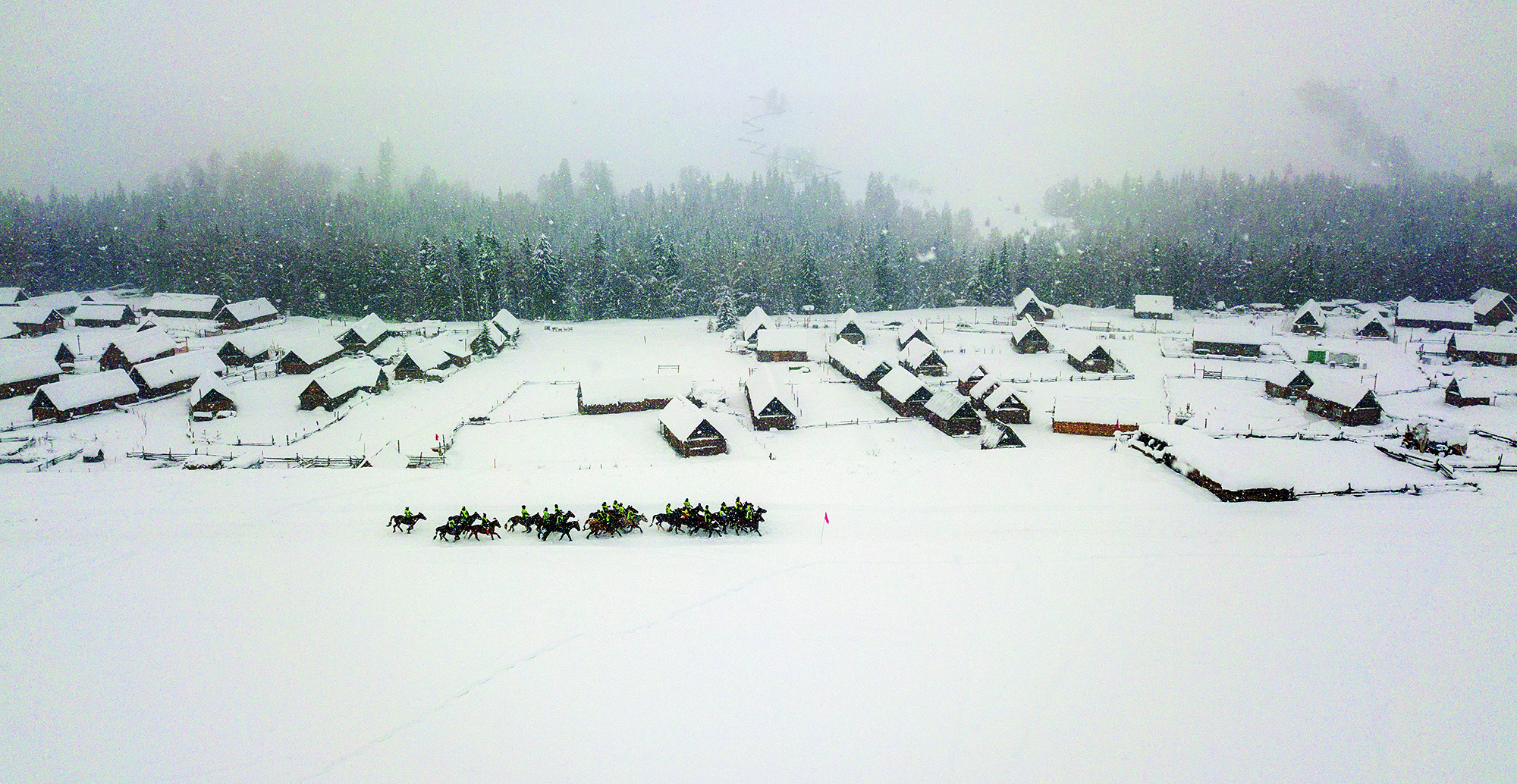 2020年1月1日,新疆维吾尔自治区布尔津县,村民们在喀纳斯禾木村举行赛马活动欢度新年