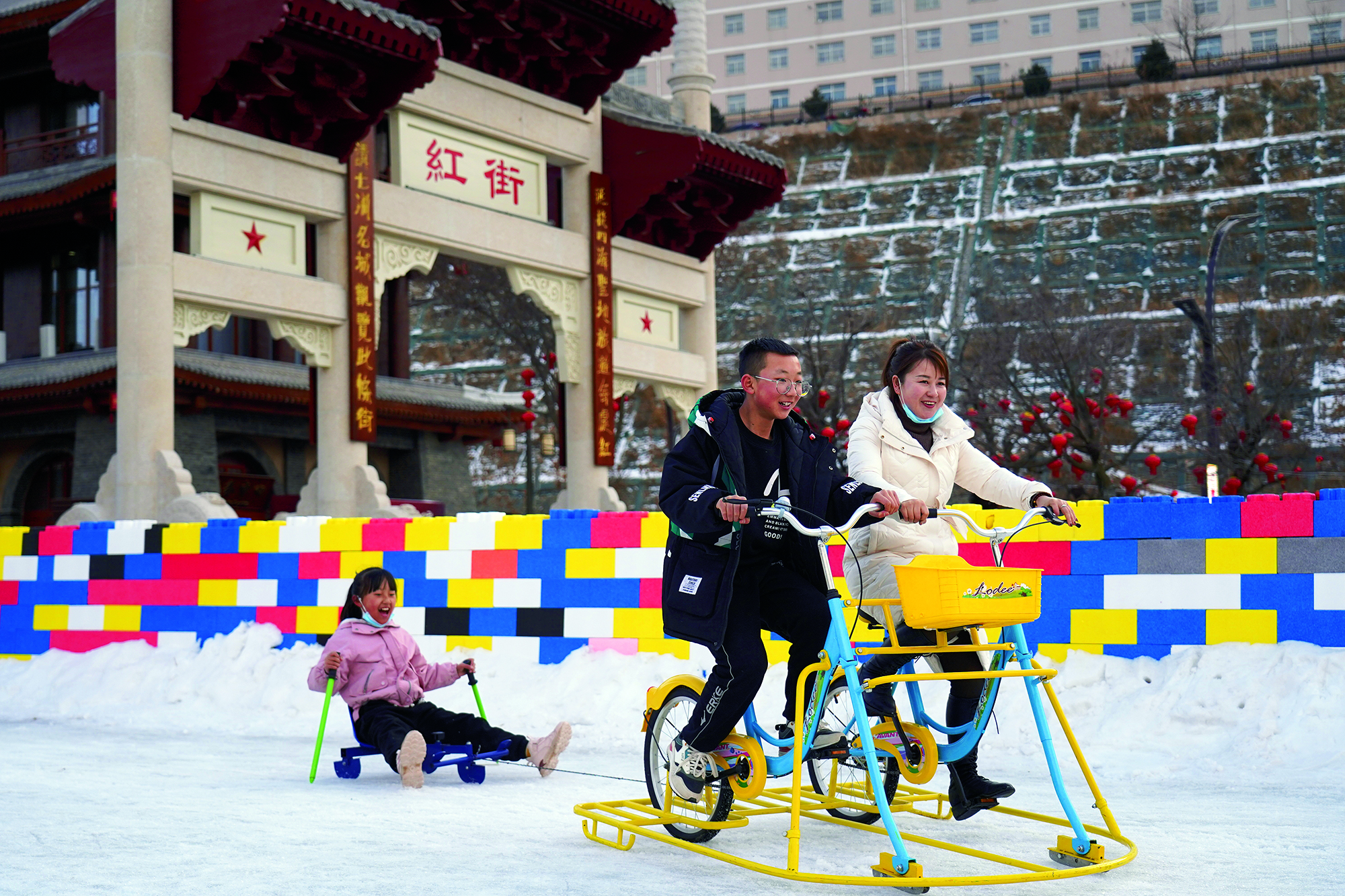 2022年2月14日,陕西省延安市,一家人在红街圣地娱雪场体验雪地自行车