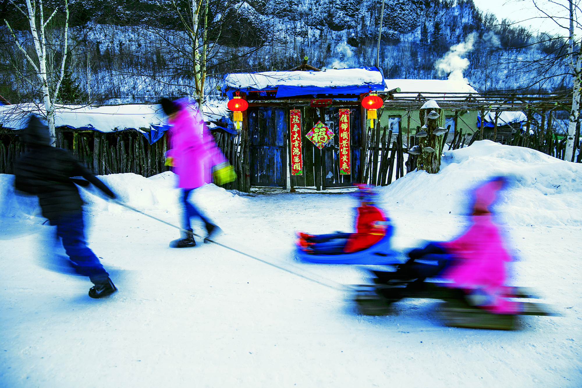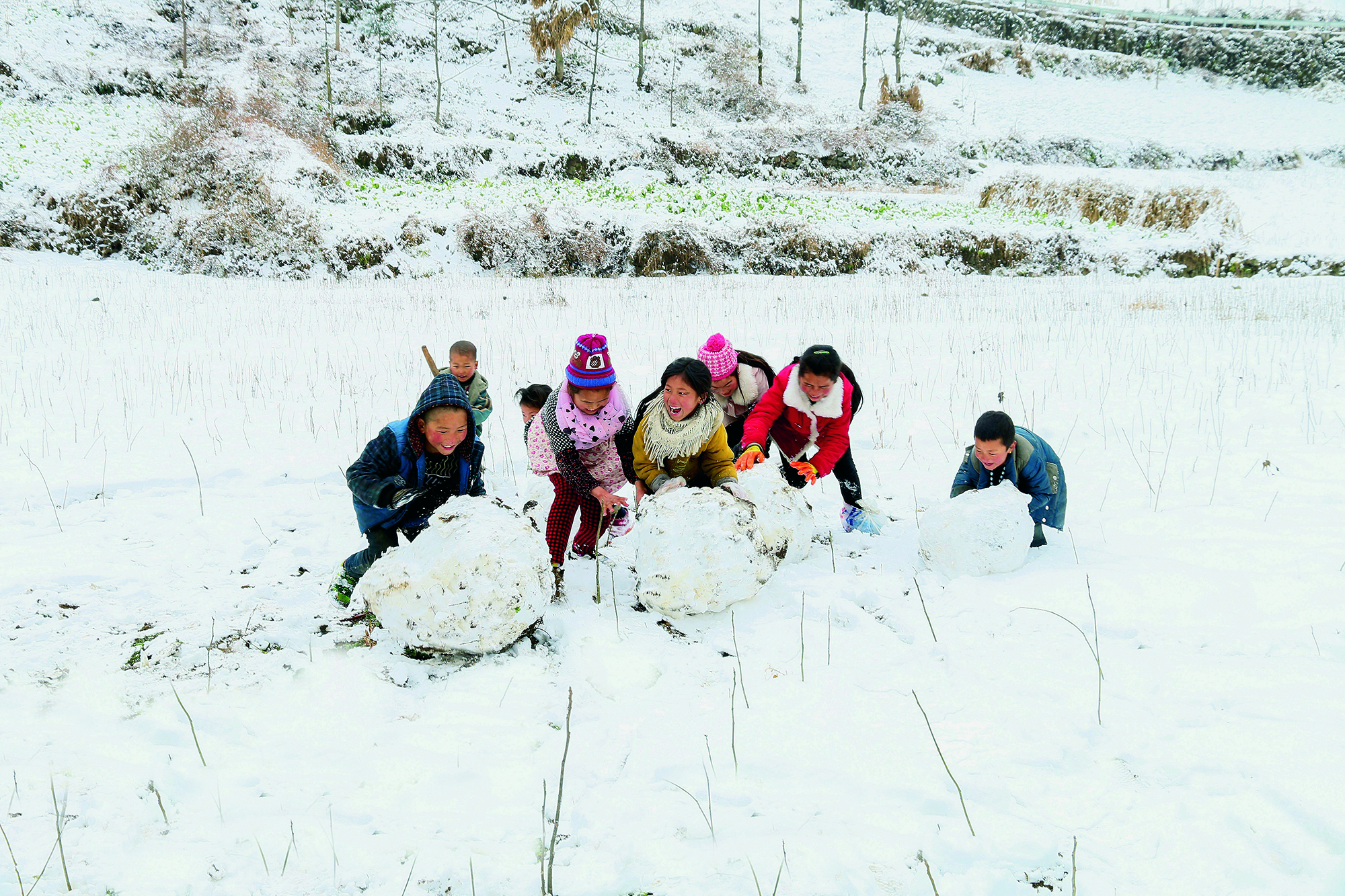 People play in the snow in Liubinpu Township of Yanqing District, Beijing, on December 16, 2019.