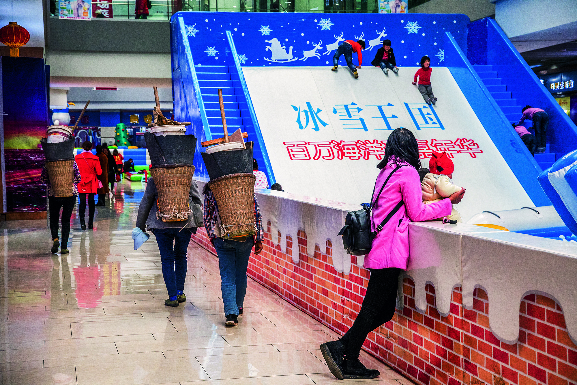 Children slide down a simulated ice slope at a shopping mall in Shizhu Tujia