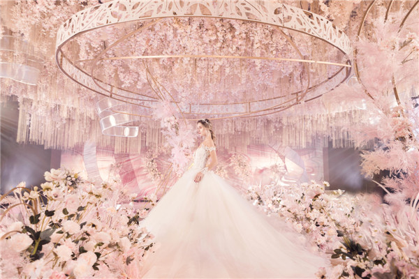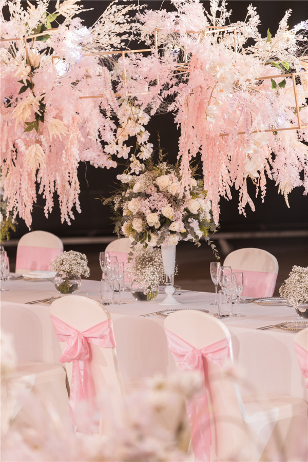整场婚礼布置以粉色为主,以大量花艺为主,打造出梦幻花开的感觉,结合金属铁艺,创造出一种光束冲破穹顶的梦幻感觉。