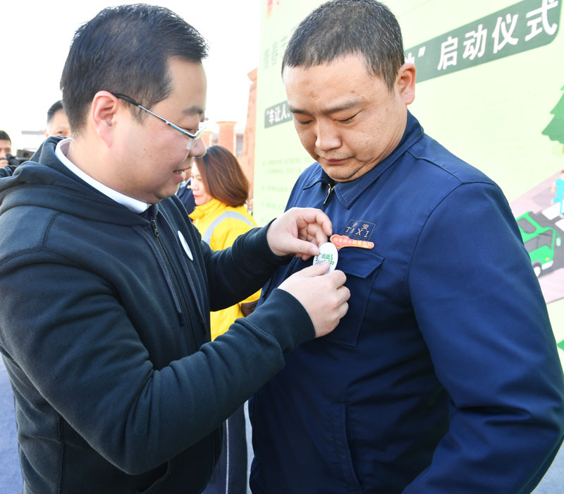 与会领导嘉宾为志愿者代表佩戴“小斑马”胸章。