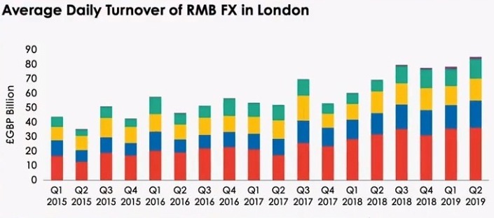 报道称,在今年4月到6月之间,伦敦离岸人民币外汇交易量占全球离岸人民币外汇交易量的43.9%,而去年同期的这一比例为38.6%。伦敦的份额增加的同时,香港以及悉尼和多伦多等其他次要中心的份额在下降。并且,这一份额几乎与伦敦在全球外汇市场(日交易量达6.6万亿美元)中的份额持平。
