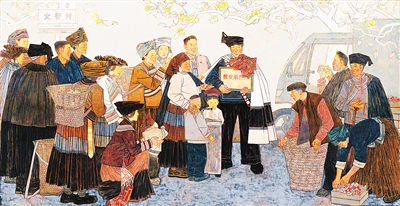 作品描绘了四川省大凉山火普村表彰脱贫示范户的场景。作品情节生动,主题突出,人物形象具有民族特色。在造型上,注重艺术概括,化繁为简;在色彩上,打破了传统工笔画的用色方法,以绚烂丰富、轻松饱和的色调表现出大凉山彝族人民脱贫时的喜悦心情和幸福场景。