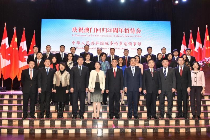 联邦参议员胡子修、市议员詹嘉礼、陈志辉、杨绮清,多伦多香港经贸处处长巫菀菁等政要,华人社团、中资机构、留学生、加拿大友好团体代表,以及塞尔维亚、斯里兰卡、孟加拉国、巴基斯坦等国驻多外交机构约500人出席了澳门回归20周年庆祝活动。