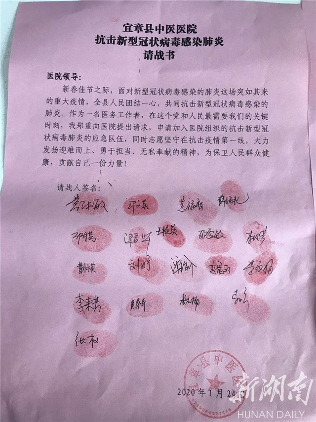 1月24日,农历除夕,宜章县人民医院举行新型冠状病毒感染的肺炎防控誓师大会。医务人员纷纷签署请战书,目前共收到个人请战书278份,集体请战书22份。