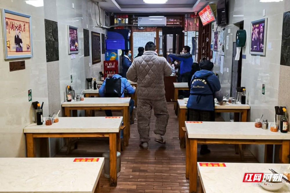 2月17日,天心区竹塘西路一栋临街住宅的门前,一个挂着“易裕和”牌匾的米粉店前,有服务员在招呼客人。该粉店老板易军介绍,为防控疫情,店内上岗员工提前三天进行了新冠肺炎核酸检测排查,结果均为阴性。此外,店内采取“限号嗦粉”的方式,所有进入该店的顾客都需进行体温检测、登记,并领取号码牌,1500平米的店内顾客人数如果超过50,就需在外等待。