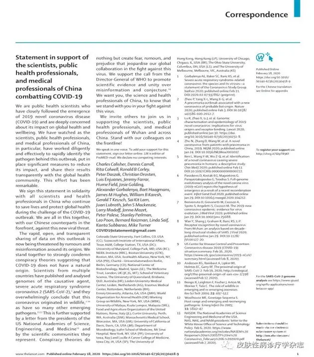 中文译文(《皮肤性病诊疗学杂志》编辑部主任张锡宝教授):柳叶刀:多国公共卫生专家发表支持中国科学家、公共卫生专业人员和医疗专业人员对抗COVID-19的声明