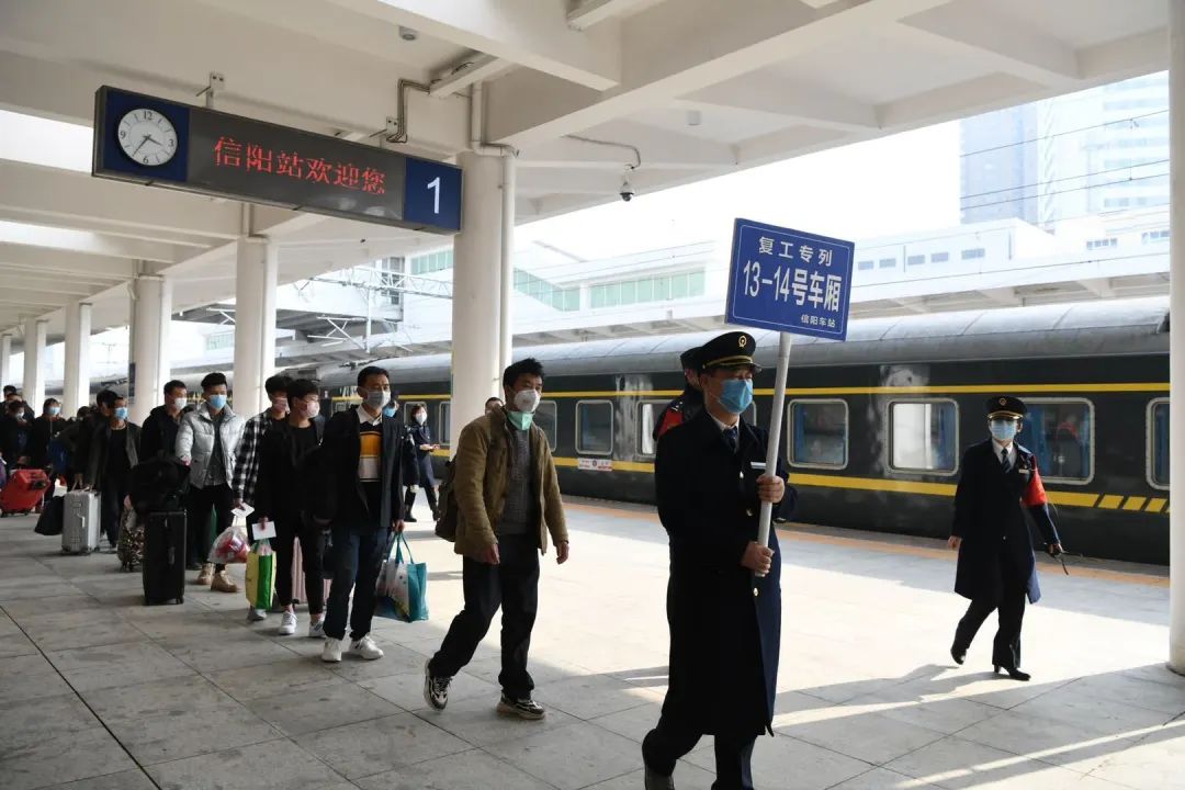 近日,各大企业相继复工复产,用工需求较大。铁路部门积极与信阳市政府、生产企业对接,“按需开车”精准制订方案,对务工人员去向相对集中的深圳、上海等地区组织开行返岗复工专列,“点对点”安全有序运送,千方百计搭建外出务工快速通道,助力外出务工人员早日返岗复工。