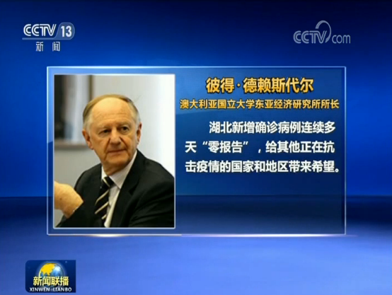 澳大利亚国立大学东亚经济研究所所长彼得·德赖斯代尔表示,湖北新增确诊病例连续多天“零报告”,给其他正在抗击疫情的国家和地区带来希望。