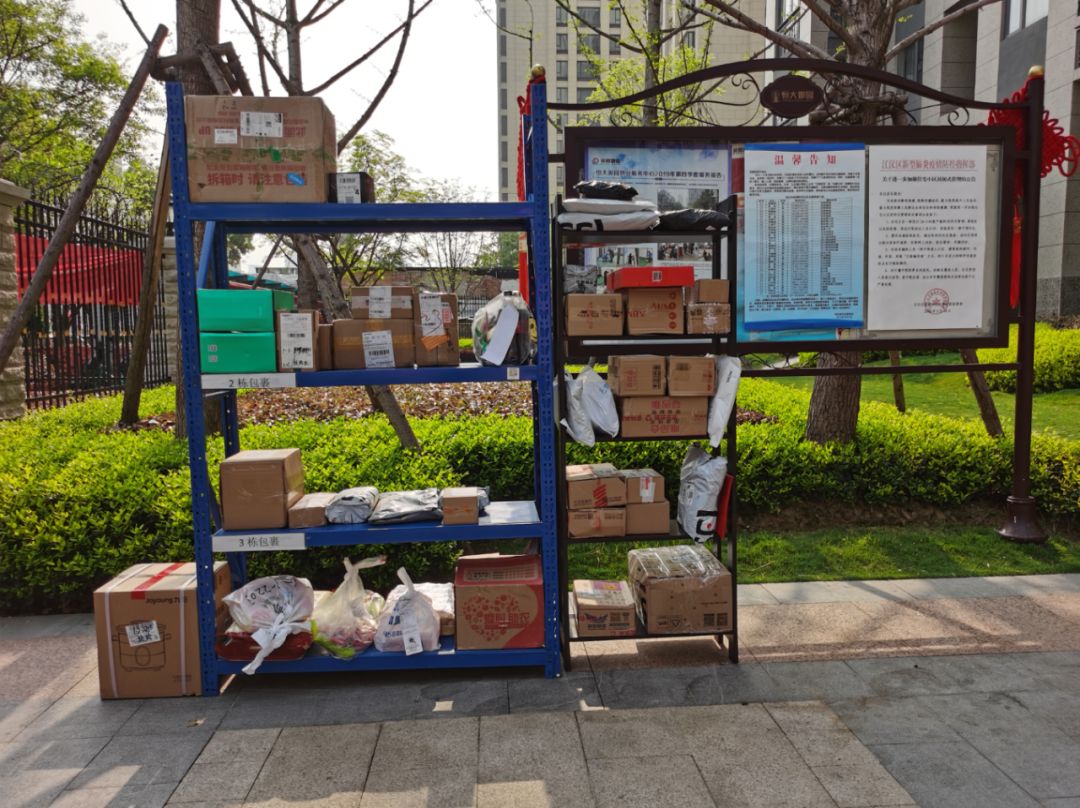 为了保证小区业主零接触收取快递,恒大御园物业在小区门口设置快递放置架,快递员将快递包裹放在快递架上。包元凯摄