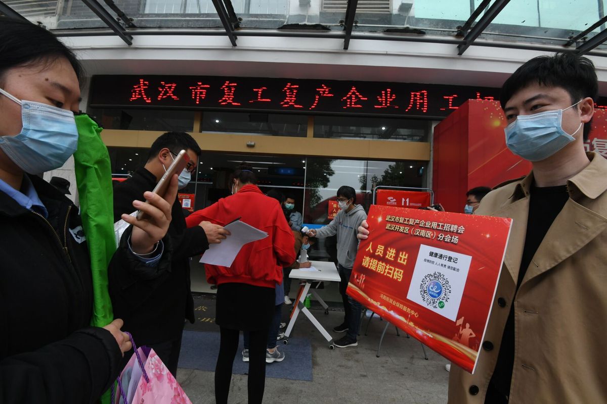 4月21日,在武汉经济技术开发区(汉南区)沌阳街招聘会场地门口,进场人员扫码核验湖北健康码“绿码”。(李子云 摄)