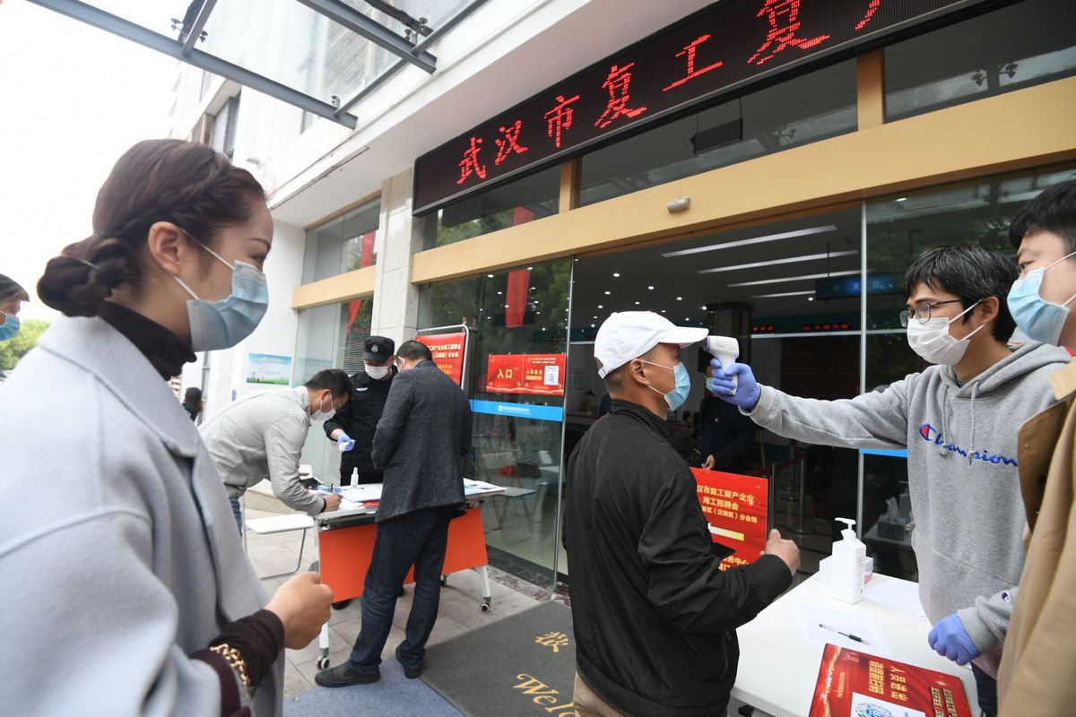 4月21日,在武汉经济技术开发区(汉南区)沌阳街招聘会场地门口,进场人员接受体温检测。(李子云 摄)