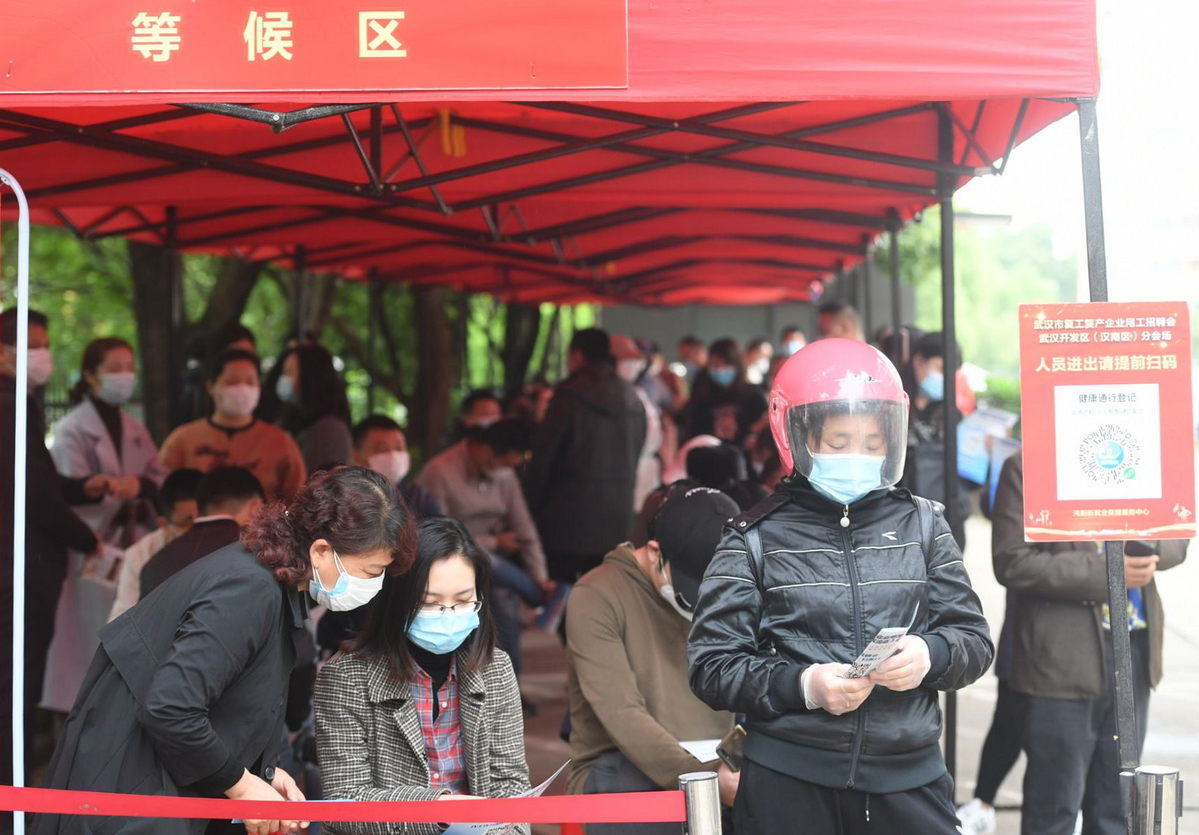 在武汉经济技术开发区(汉南区)沌阳街招聘会现场,参加招聘会的进场人员需佩戴口罩、扫码并出示湖北健康码“绿码”、接受体温检测,各招聘展台及排队求职者需保持在1.5米以上间隔距离。