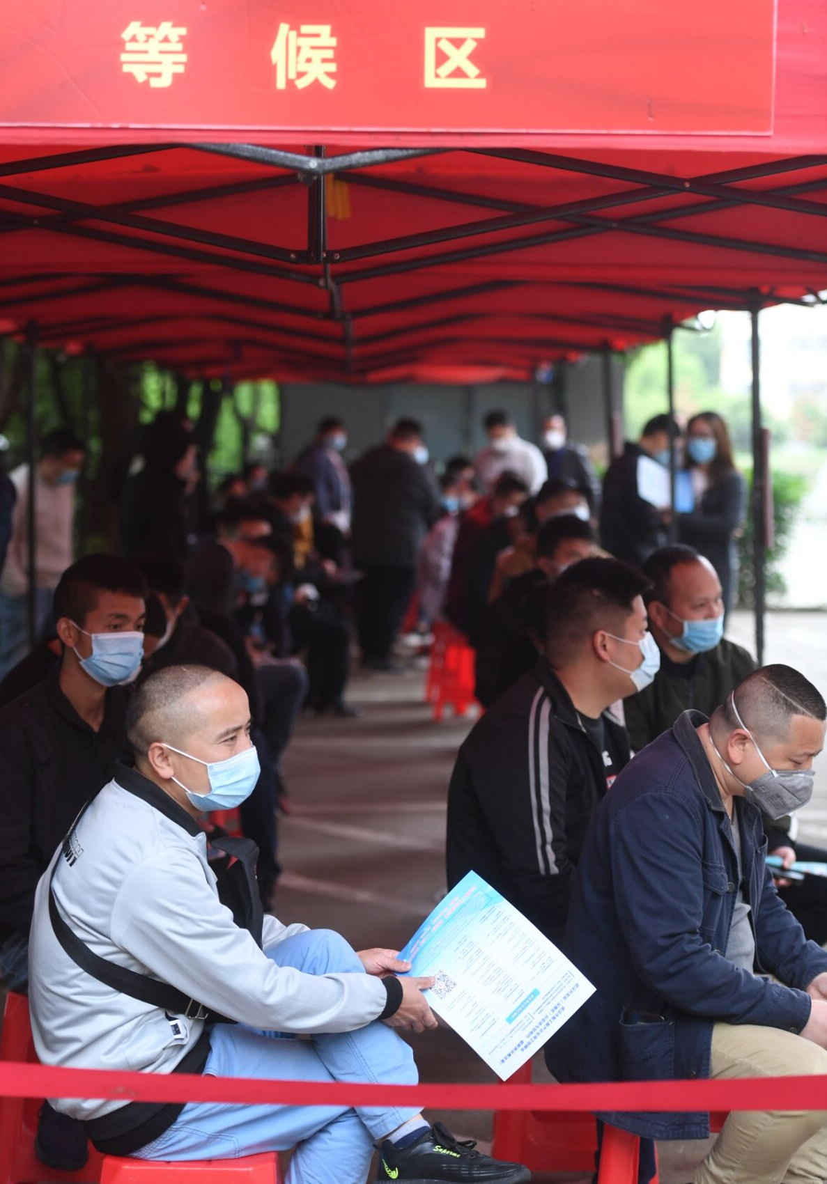 4月21日,在武汉经济技术开发区(汉南区)沌阳街招聘会场地门口,求职人员在等候。(李子云 摄)
