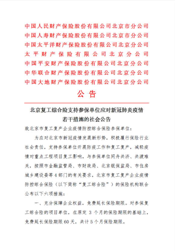 自6月11日北京新发地突发疫情以来,北京地区疫情防控形势再次进入严峻状态,给有序开展复工复产的市重点工程项目造成了一定影响。为切实保障参保单位当前疫情形势下可能带来的损失风险,在北京银保监局、市金融监管局等四部门的指导下,中国人民财产保险股份有限公司北京市分公司、中国人寿财产保险股份有限公司北京市分公司、中国太平洋财产保险股份有限公司北京分公司、太平财产保险有限公司北京分公司、中国平安财产保险股份有限公司北京分公司、中华联合财产保险股份有限公司北京分公司和中国大地财产保险股份有限公司北京分公司七家北京复工综合险服务机构联合出台六项措施支持参保单位应对疫情,切实减轻重点工程项目因疫情带来的影响。