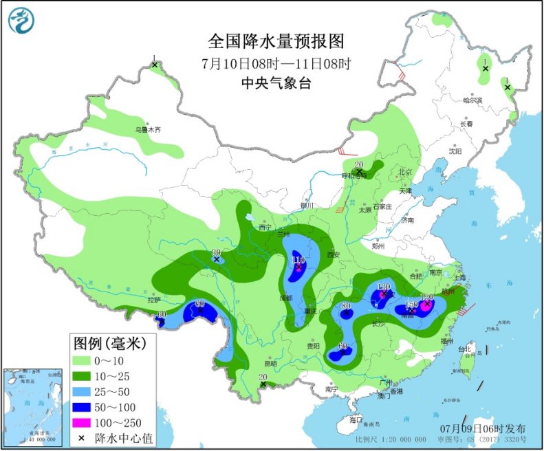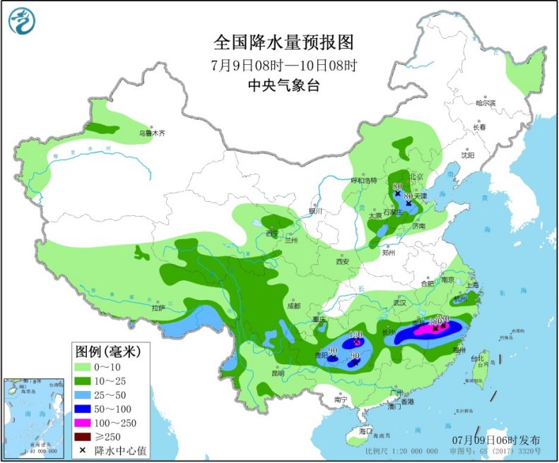 中央气象台继续发布暴雨橙色预警:预计今明两天(9日至10日),贵州至长江中下游地区仍有强降雨天气;9日,主雨带位于贵州中南部及江南中北部等地,江西中部、福建西北部、湖南西南部等地的部分地区有大暴雨,局地特大暴雨(250~280毫米);10日,雨带略有北抬,强降雨范围和强度有所减小,但湖北东南部、湖南北部、江西北部、广西北部、四川北部、甘肃南部等地的部分地区有暴雨或大暴雨。11日,雨带移至四川盆地、西北地区东南部、黄淮一带,强降雨范围将再次扩大。