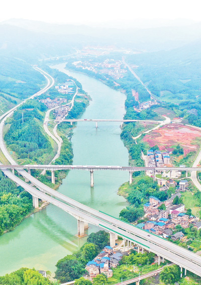 一列动车行经广西三江侗族自治县浔江特大桥。