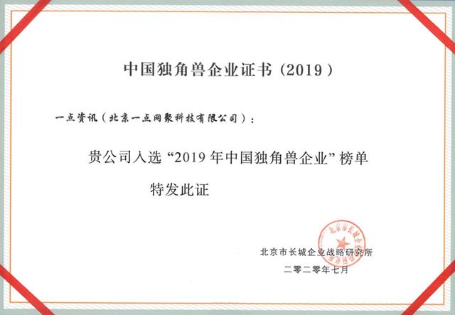2020年7月28日,由长城战略咨询主办的中国高成长企业发布会暨中国独角兽企业研究报告发布会在津举办,移动互联网内容聚合平台一点资讯与字节跳动、快手等多家新文娱赛道"选手"入选"2019中国独角兽企业"榜单。