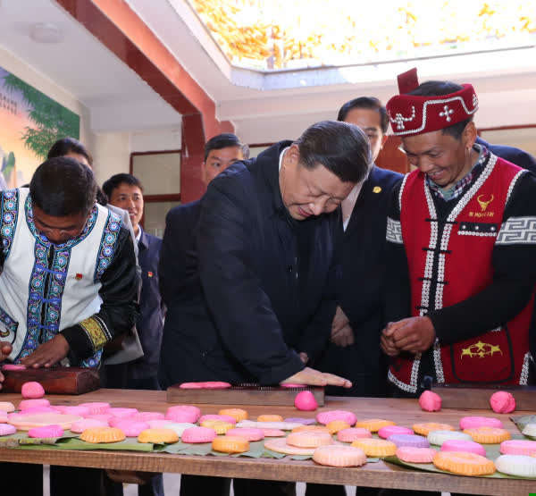 2020年1月19日下午,习近平总书记在腾冲市清水乡三家村中寨司莫拉佤族村,同村民李发顺一家制作当地节日传统食品大米粑粑。 新华社记者 鞠鹏 摄