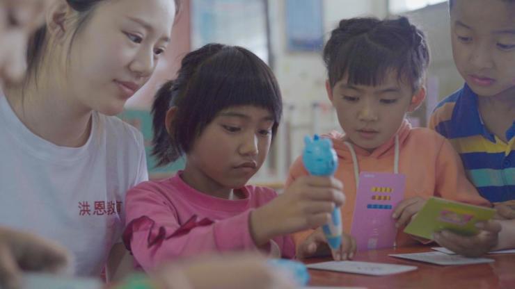 (洪恩教育老师教授孩子们使用点读笔)