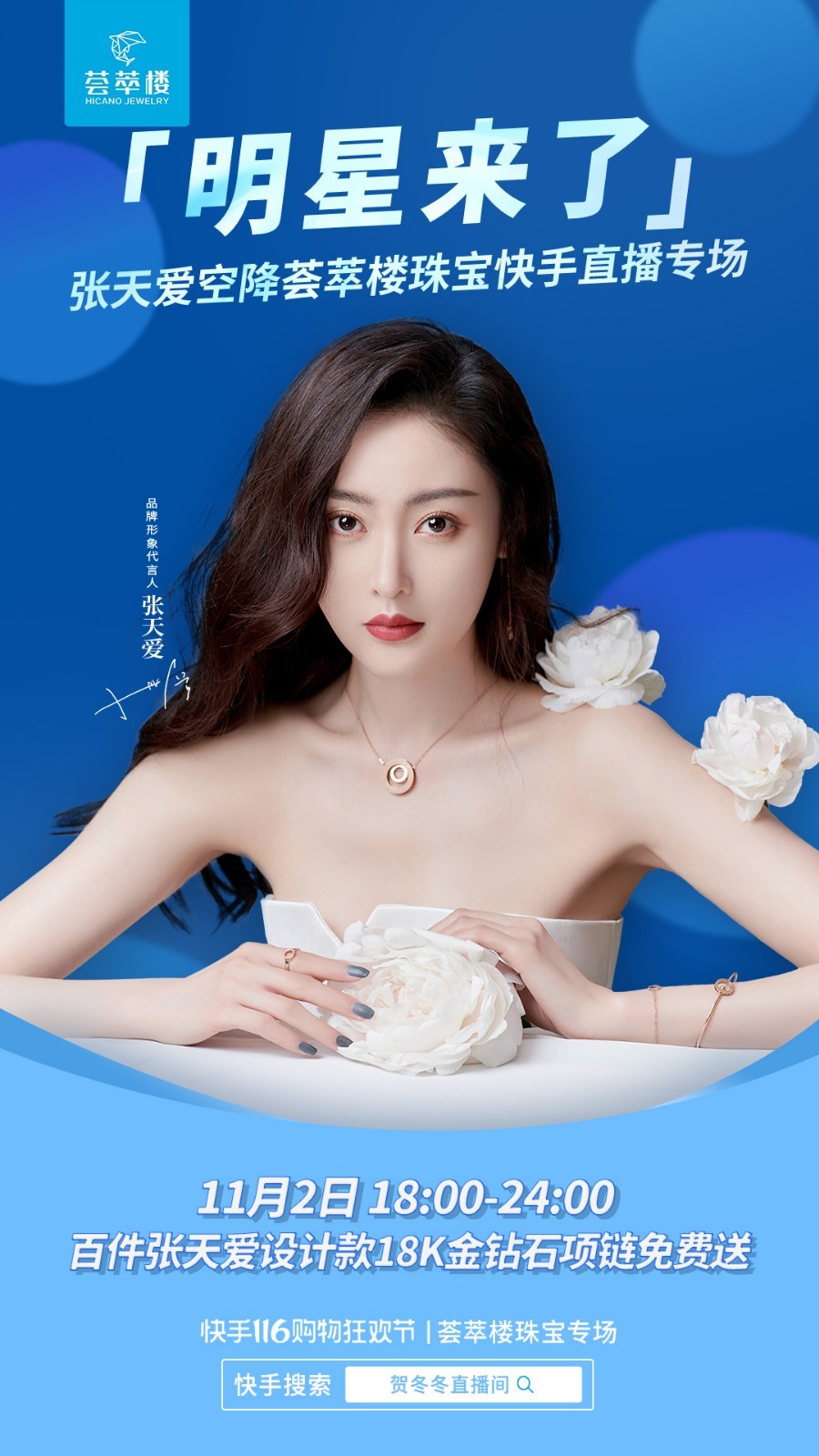 2020年11月2日,荟萃楼珠宝联合快手116购物狂欢节共同打造荟萃楼珠宝直播专场,荟萃楼珠宝品牌代言人张天爱作为星推官亲临直播间,为粉丝推荐珠宝好物,豪气送出100件亲自设计的海豚钻石项链,让本场直播火爆异常,整场直播观看人数高达512.9万人,直播点赞次数2562万,直播总成交额1.14亿!