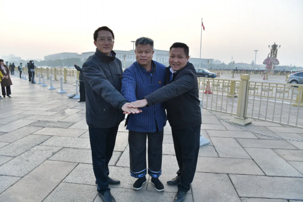 11月6日,十八洞村三任扶贫工作队长龙秀林(中)、石登高(左一)、麻辉煌(右一)观看升国旗仪式后同国旗合影 新华社记者李贺 摄