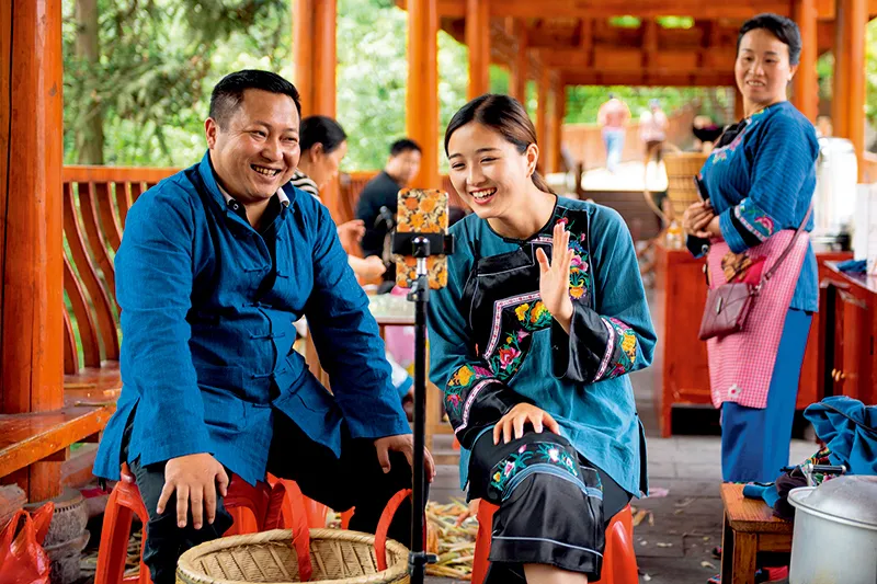 5月15日,十八洞村第三任扶贫工作队队长麻辉煌(左)与返乡大学生施林娇一起通过网络直播推销土特产新华社记者陈思汗 摄