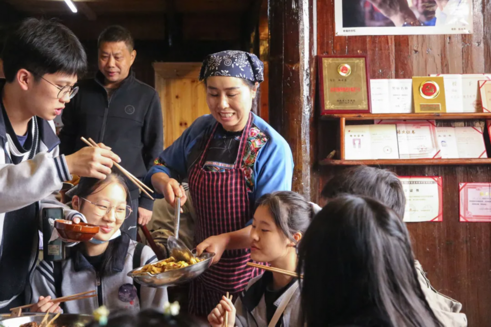 10月26日,十八洞村村民施进兰的妻子龙齐英(中)在农家乐给游客们上菜(受访者供图) 新华社发
