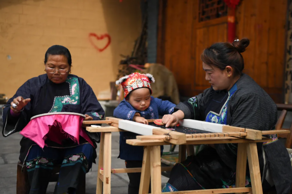 4月24日,绣娘们在十八洞村苗绣特产农民专业合作社绣苗绣,这是十八洞村发展的一项特色产业 新华社记者薛宇舸 摄