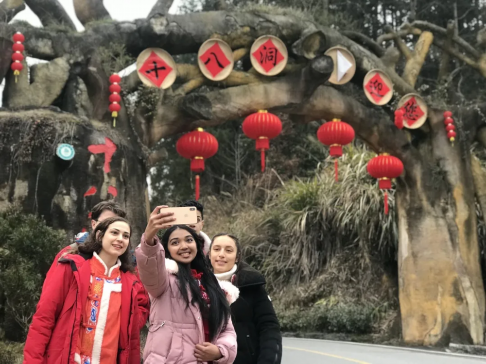 1月18日,多位外国友人受邀来到湘西十八洞村参加十八洞村的小年“村晚”,他们在十八洞村口合影新华社记者张玉洁 摄
