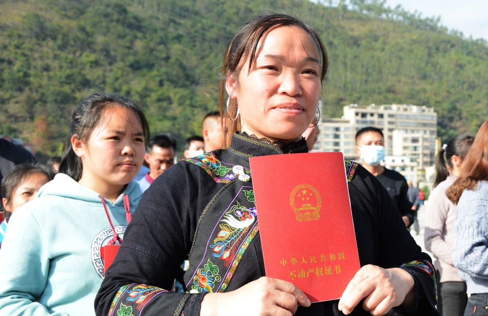 “国家的政策太好啦,把我一家从山窝窝搬到城里来,现在居住的房子有了产权证,我这心里真踏实。”11月15日,在贵州省黔西南州册亨县易地扶贫搬迁安置住房不动产权证颁发仪式现场,搬到县城纳福新区百福居住区的布依族妇女王永肖领到不动产登记证后激动地说。
