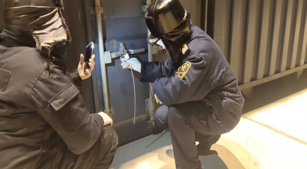 图为:兰州海关所属金城海关工作人员对进口亚麻籽集装箱进行现场验核。张莉/摄