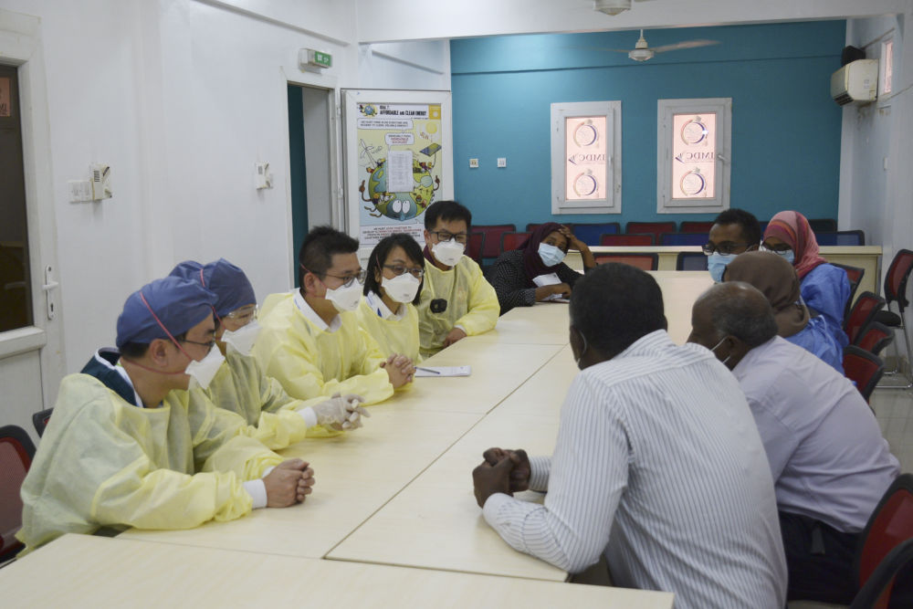 2020年6月2日,在苏丹喀土穆的易卜拉欣·马利克教学医院,中国抗疫医疗专家组成员同苏丹医务工作者交流。(新华社记者马意翀摄)