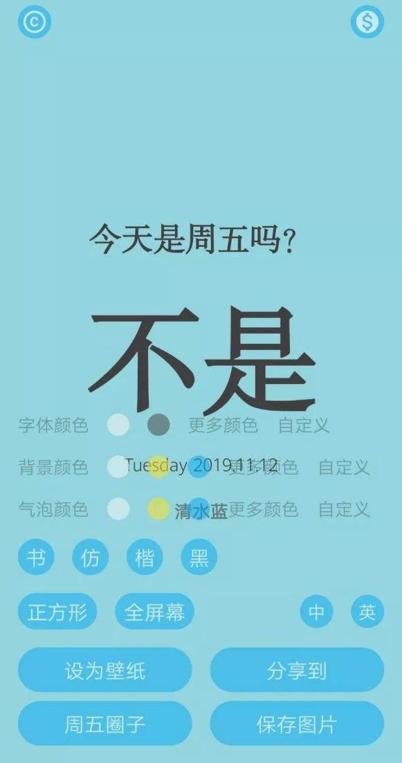 打开这款app,原来是个周五主题壁纸DIY生成的APP,可以随心情定义壁纸的颜色。它唯一的实用性功能就是提醒你今天是不是周五,剩下的功能都是用来“杀时间”。使用过程中,周一到周四当然是没有“惊喜”的,但是只要到了周五,整个界面都会“兴奋”起来,用户也随之振奋。