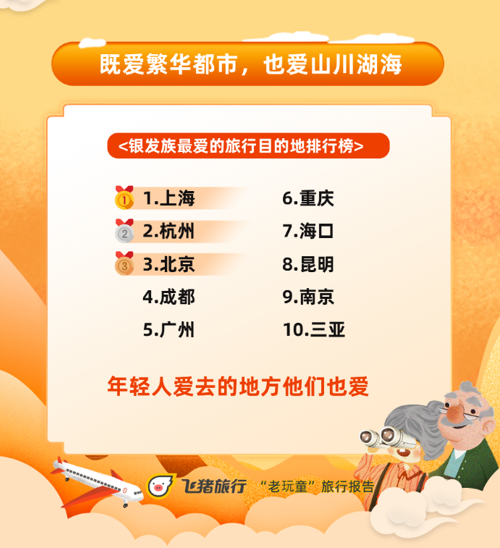 在旅游目的地的偏好上,这届银发族与年轻人口味相投,一线城市上海、北京、广州和杭州排在前列,巴适得很的川渝、适合放松身心的海南云南也是银发族的心头好。