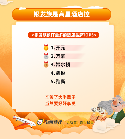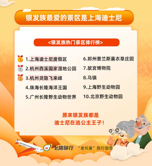 爱旅游的银发族元气爆棚,老了也要当公主。按照购买订单量排名,上海迪士尼是飞猪平台上“老玩童”最爱的景区。老牌风景名胜区杭州西溪湿地、灵隐寺飞来峰、乌镇和故宫博物院,适合家庭游的主题乐园动物园珠海长隆海洋王国、广州长隆野生动物世界、上海野生动物园也备受青睐。