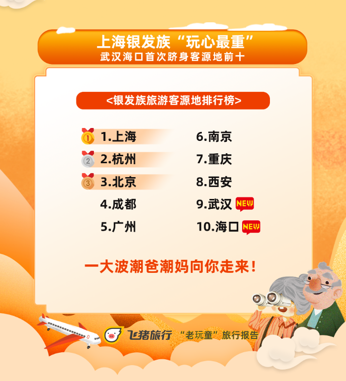 哪里的“老玩童”玩心最重?上海、杭州和北京排在前三。成都、广州、南京、重庆、西安、武汉和海口均在热门客源地前十。英雄城市武汉、新增免税购物的海口首次跻身热门客源地前十。