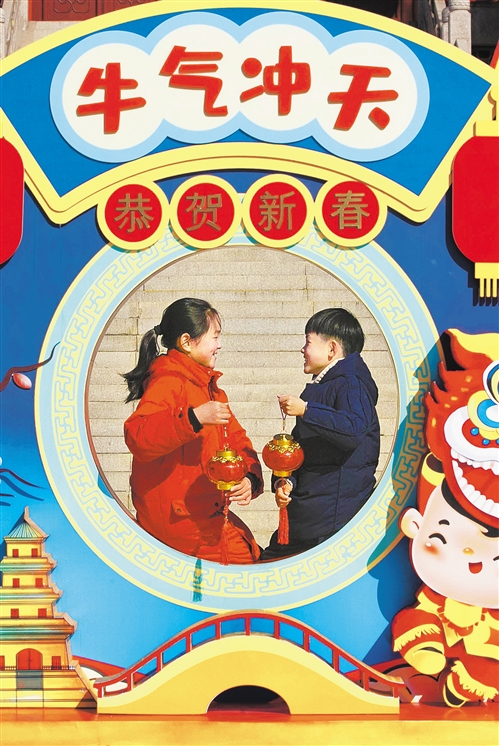 2月9日,江苏省泰州市小朋友在望海楼前戏耍。古城泰州喜气洋洋,年味十足。 汤德宏摄