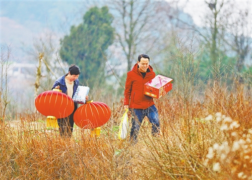 2月8日,湖南省双峰县井字镇集市,两名置办年货的村民背着中国结“福”字行走在人群中。李建新摄