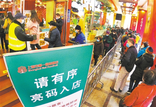 2月8日,位于上海市黄浦区的上海市第一食品商店,市民排队“亮码入店”购买年货。 种 楠摄
