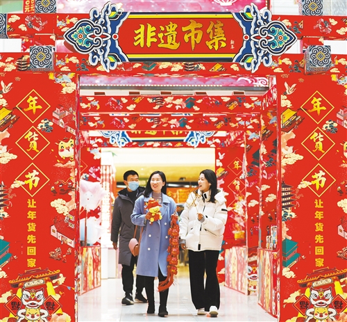2月10日,河北省迁安市游客正在“非遗年味市集”上购物赏景。春节临近,迁安市“非遗年味市集”汇集了丰富多彩的非遗文化项目和民俗文化展,为市民送上丰富的“年味大餐”。蔡常颖摄