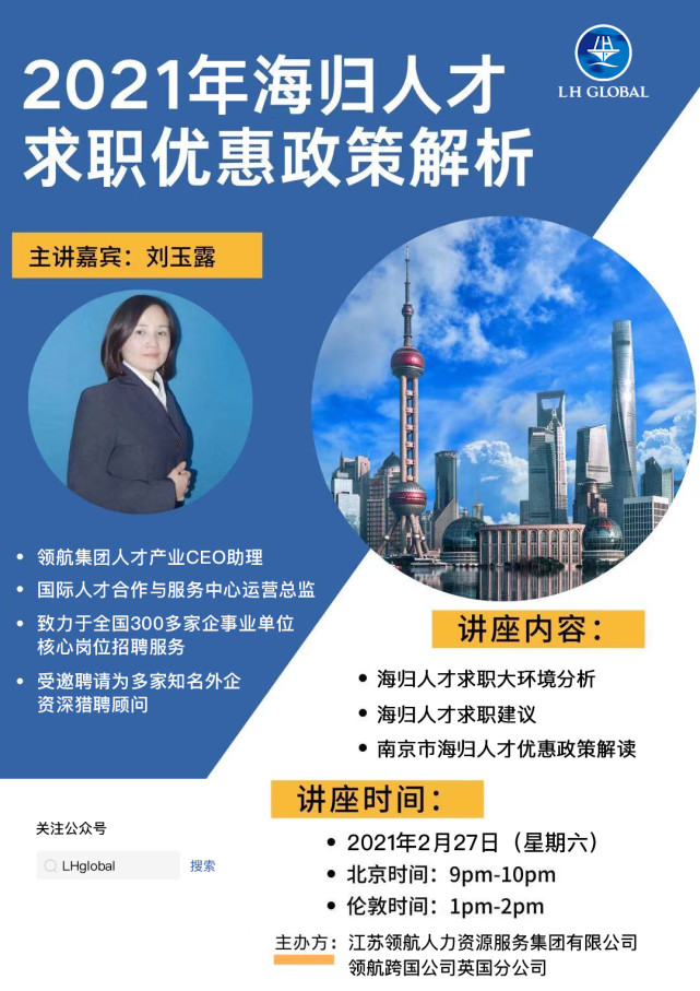 后疫情时代,每位海归人才都面对着无数的问题和新的选择。2021年海归人才求职也牵动着不少家长和同学的心。为了帮助海归人才快速调整自己的心态,积极高效地准备求职面试,顺利拿到心中满意的offer,领航集团邀您抢“鲜”关注《2021年海归人才求职优惠政策解析》系列讲座。
