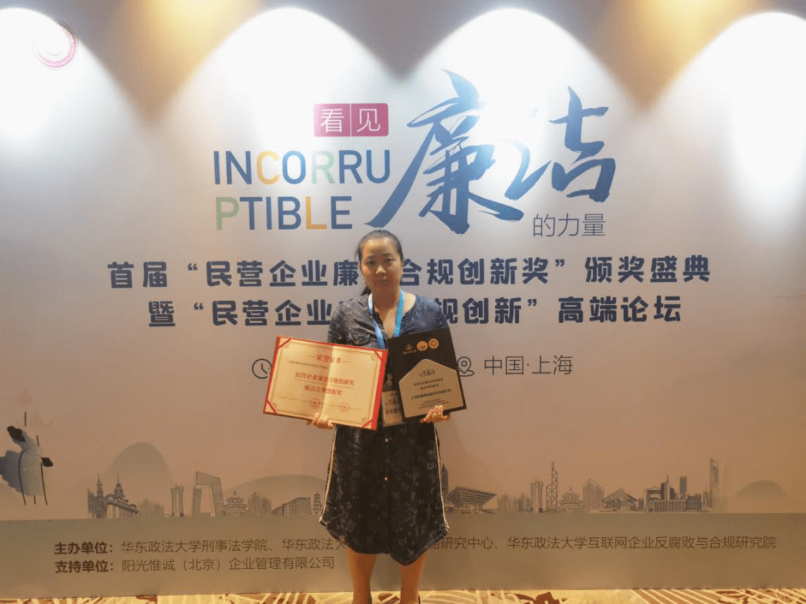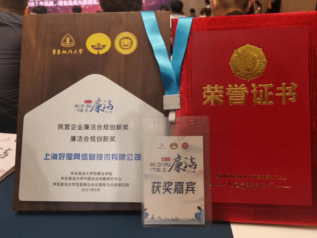 6月5日,首届“民营企业廉洁合规创新奖”颁奖典礼于上海隆重举办,此次颁奖盛典,是由华东政法大学刑事法学院、华东政法大学互联网企业反腐败与合规研究院、阳光诚信联盟联合发起,好屋集团审计中心凭借创新、领先的廉洁合规建设,在上千家知名互联网企业中脱颖而出。