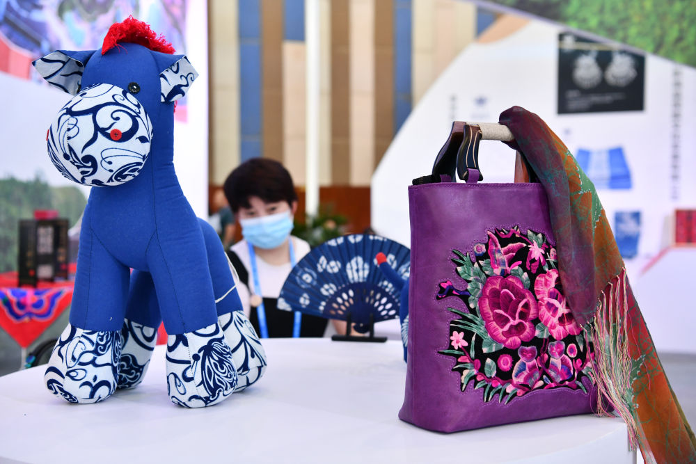 7月12日,在2021年生态文明贵阳国际论坛绿色产品展区,参展商在整理民族工艺品。