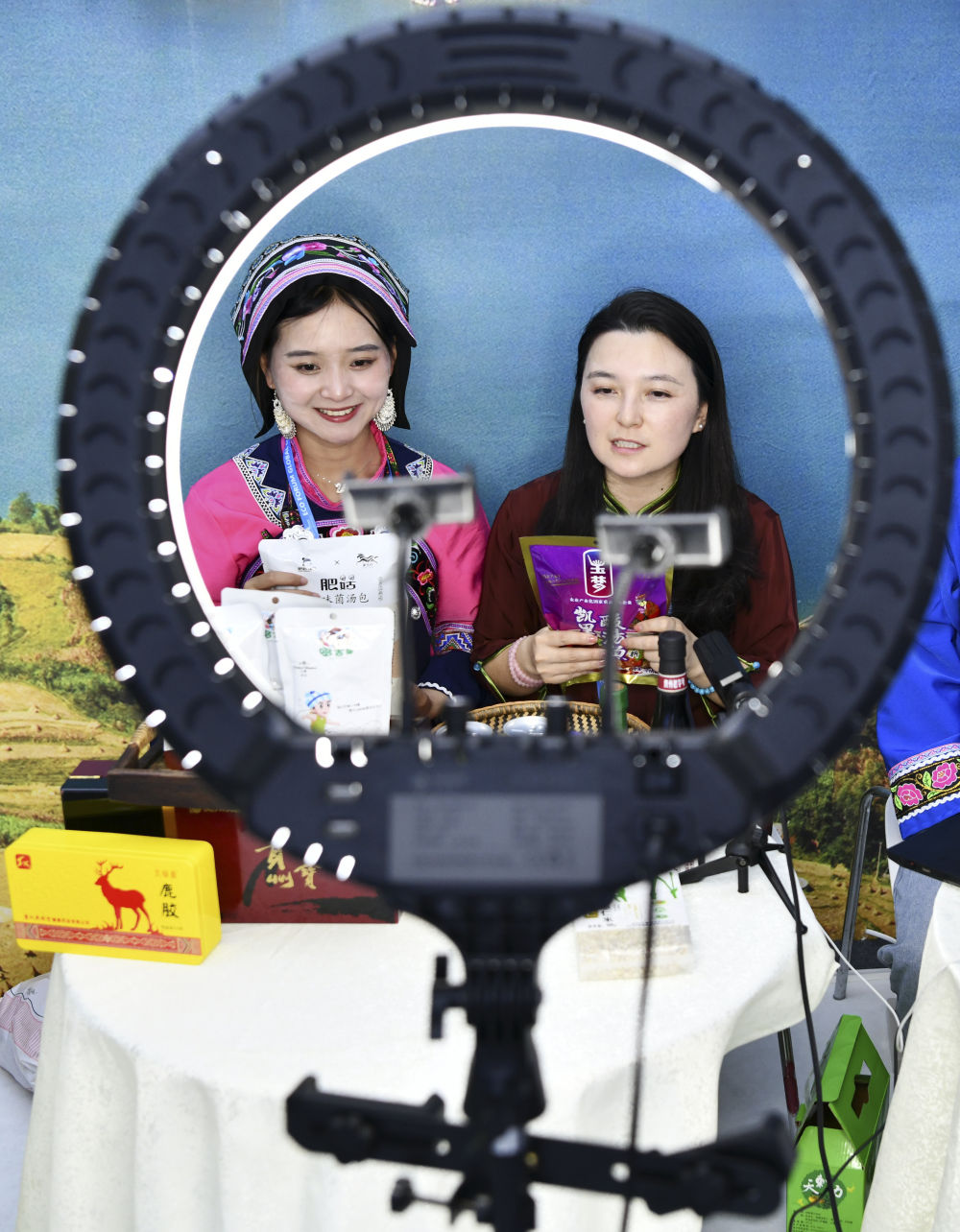 7月12日,在2021年生态文明贵阳国际论坛绿色产品展区,参展商在直播产品。