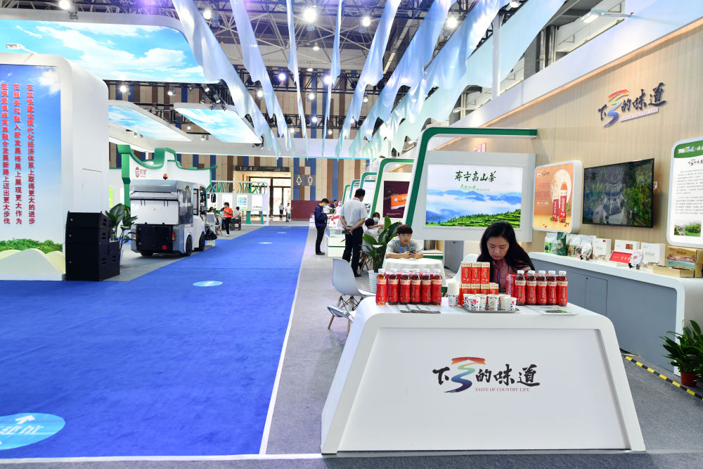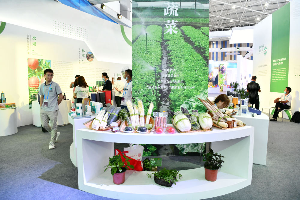 7月12日,在2021年生态文明贵阳国际论坛绿色产品展区,参会者在参观农产品。