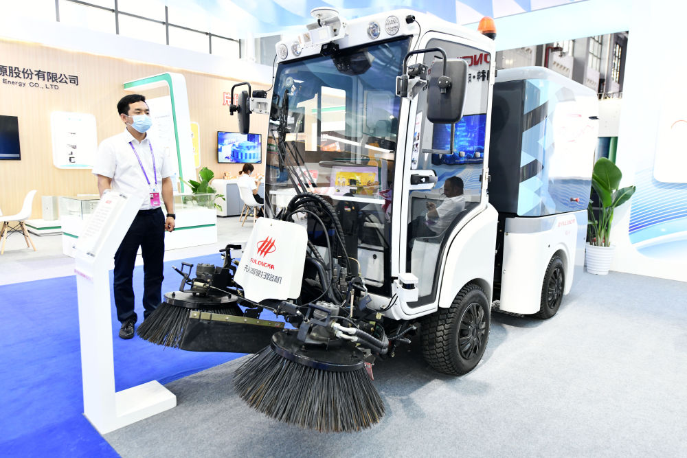 7月12日,在2021年生态文明贵阳国际论坛绿色产品展区,参展商在展出一款无人驾驶扫路机。